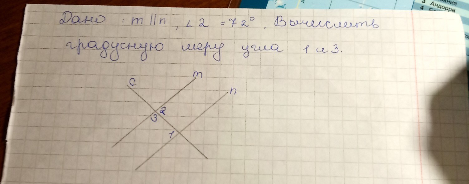 Рассмотрим угол 2 и 3. Они смежные, следовательно их сумма 180 градусов. (180-72)= 108 градусов - это угол 3.