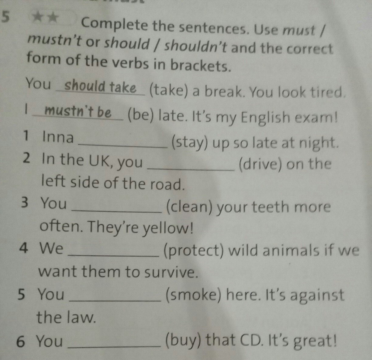 1.should, 2. Mustnt 3. Should, 4 must 5 mustnt 6 should