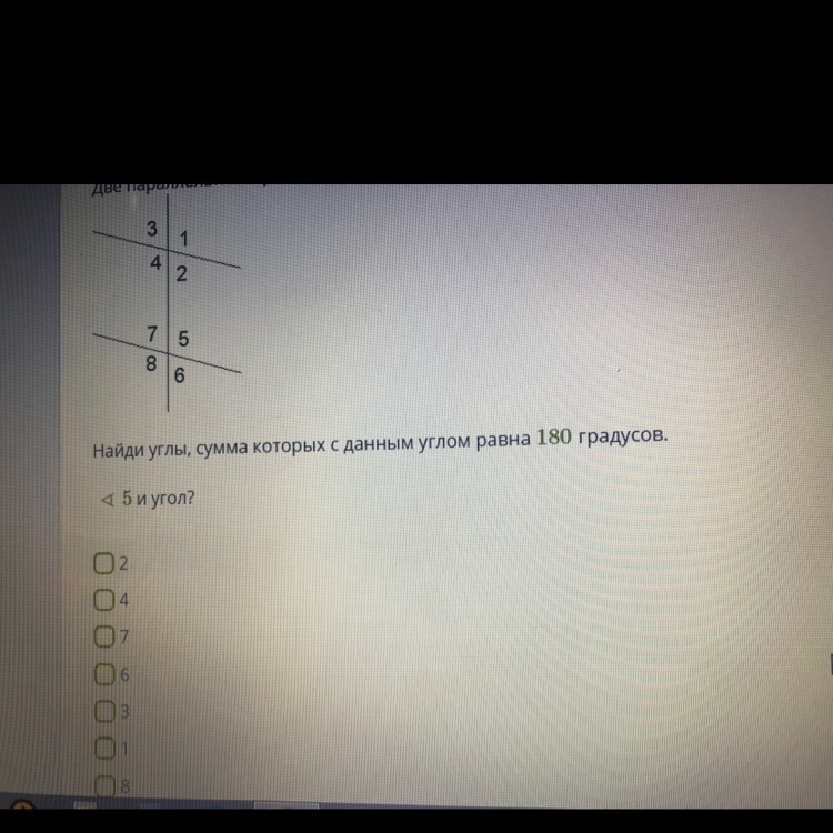 Сумма углов с данным углом(5) равна 180 градусов со следующими углами 7;6;2;4.