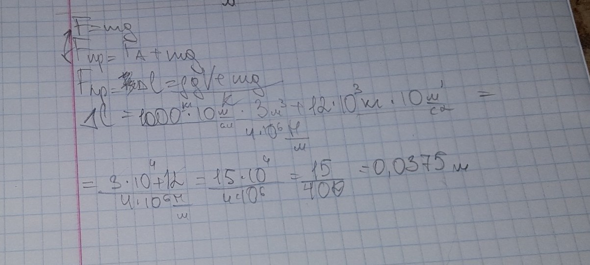 Реши задачу:На сталевому тросі , жорсткість якого становить 4 MH / м , повільно піднімають у воді затонулу статую об'ємом 3 м3 і масою 12 т . Знайдть видовження троса .