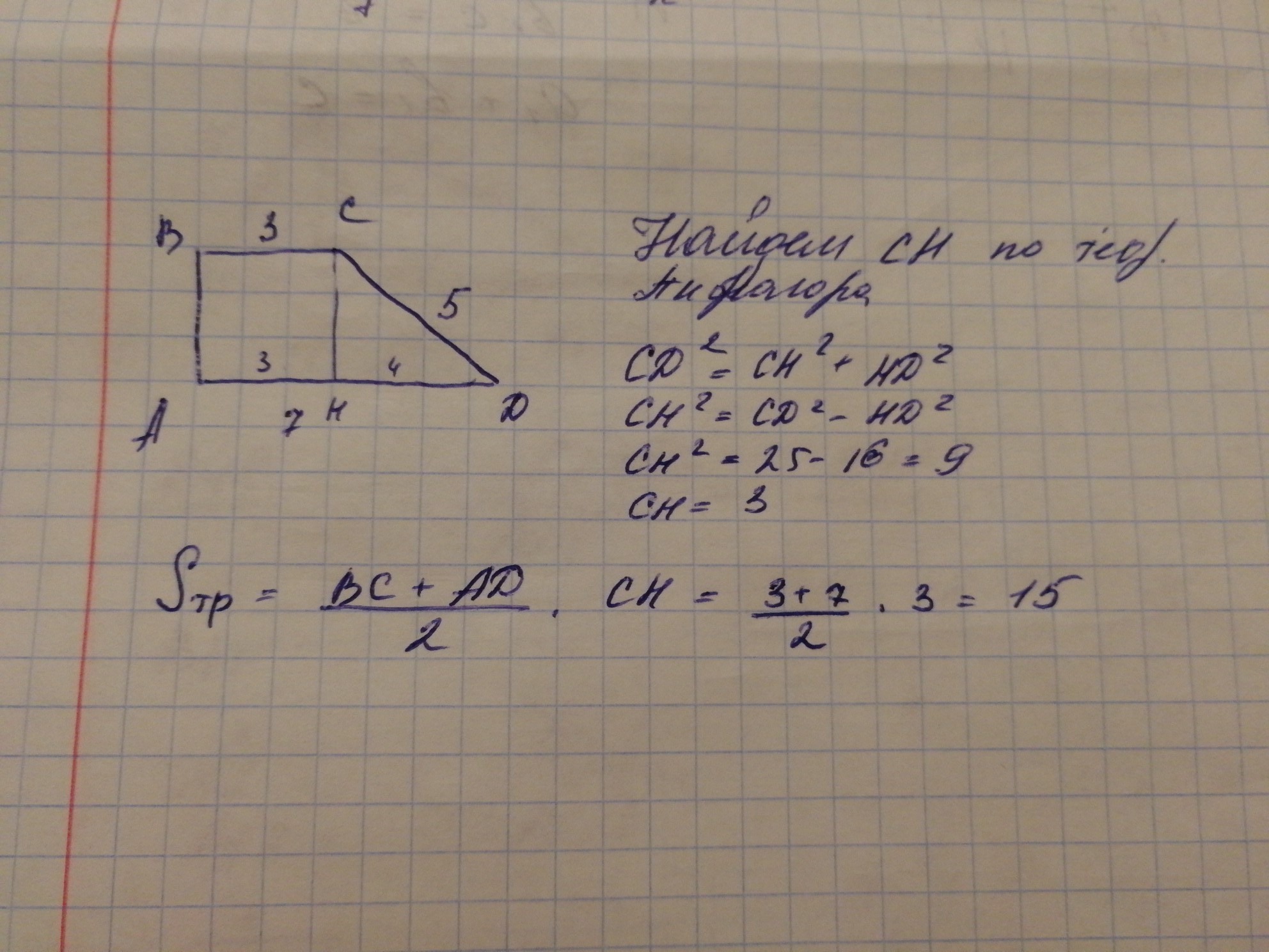 Основы прямоугольной трапеции равны 3 см и 7 см, а большая боковая сторона-5 см. Найдите площадь трапецию.