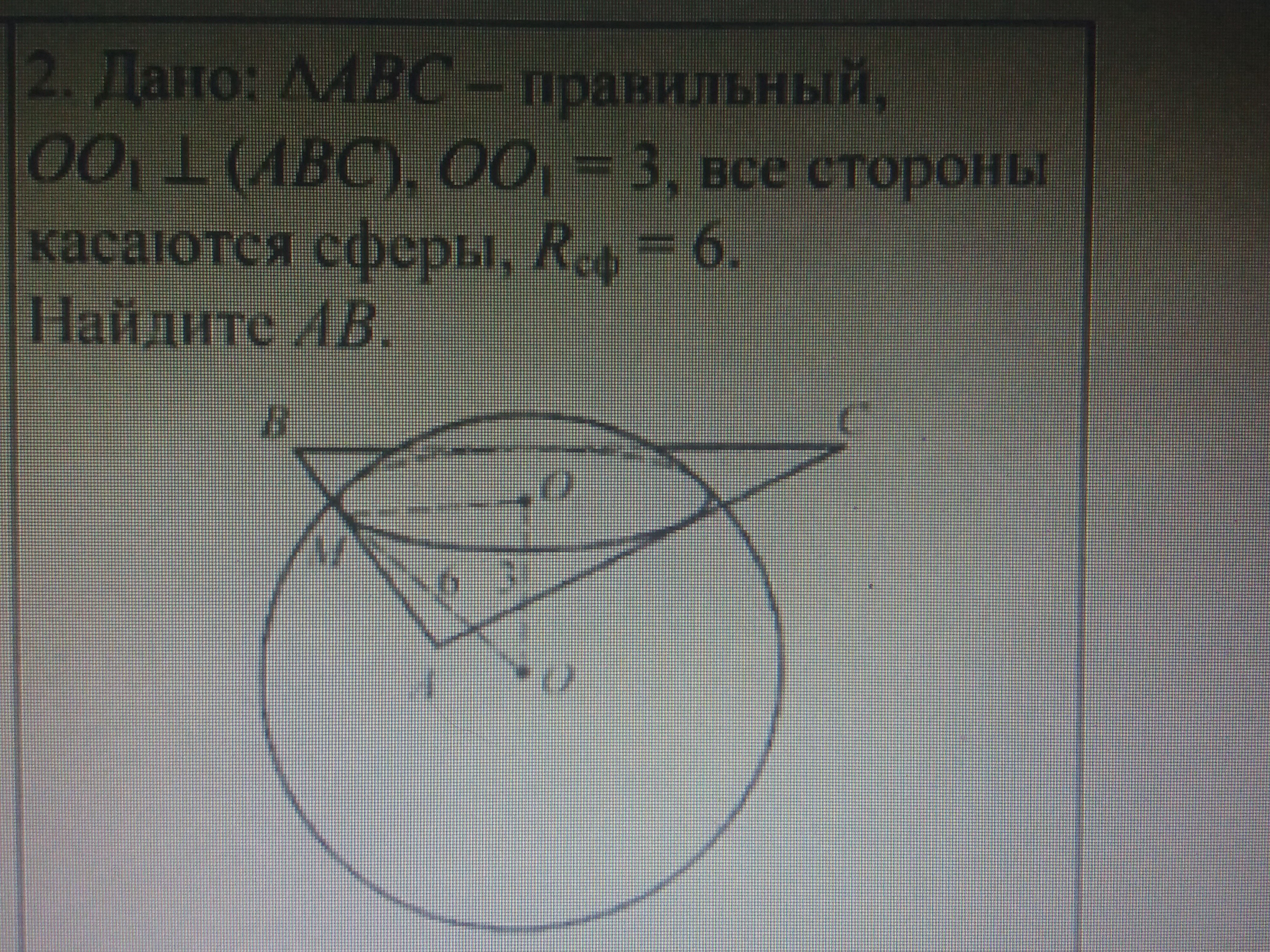 Срочно!!! Дано: АВС-правильный треугольник, ОО1=3, R=6. Найдите AВ. рисунок во вложении
