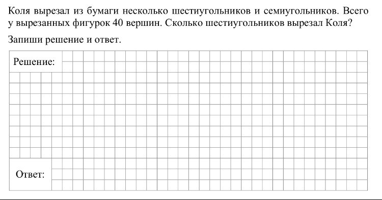 если х=4: у=(38-24)/7 делится нацело (=2) - значит Ваня вырезал 4 шестиугольника и 2 семиугольника.