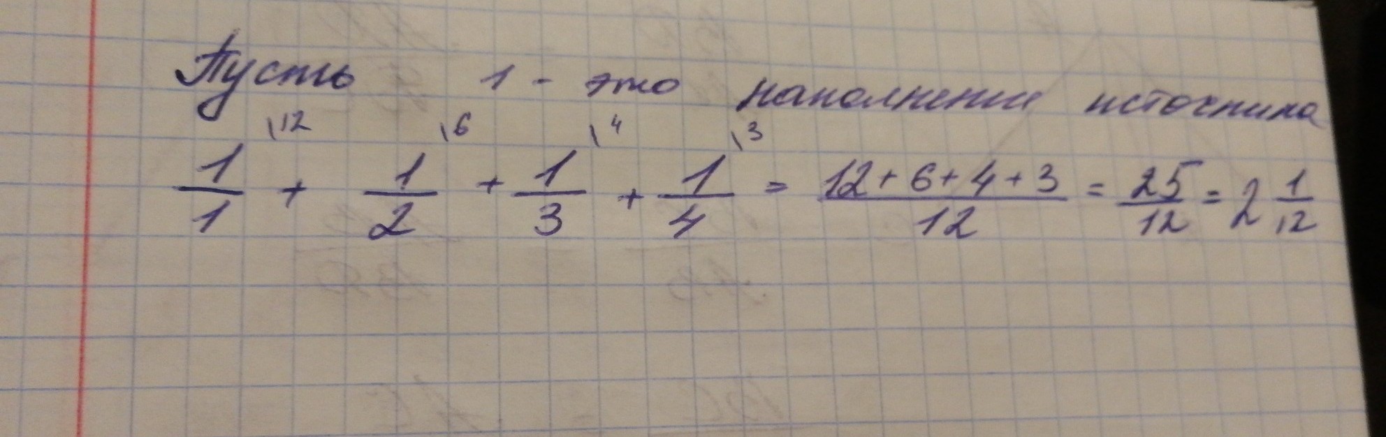 Из под земли бьют 4 источника. Первый заполняет бассейн за 1день второй за 2дня третий за 3дня и четвертый за 4дня. За сколько времени наполнят все 4 источника вместе?