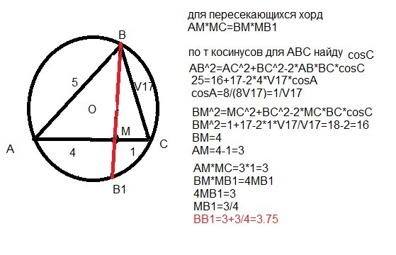 В треугольнике abc со сторонами AB=5, BC= корень из 17, CA=4 на стороне C взята точка M так,что СМ=1. Найти длину хорды проходящей через точки B и M окружности описанной около треугольника ABC