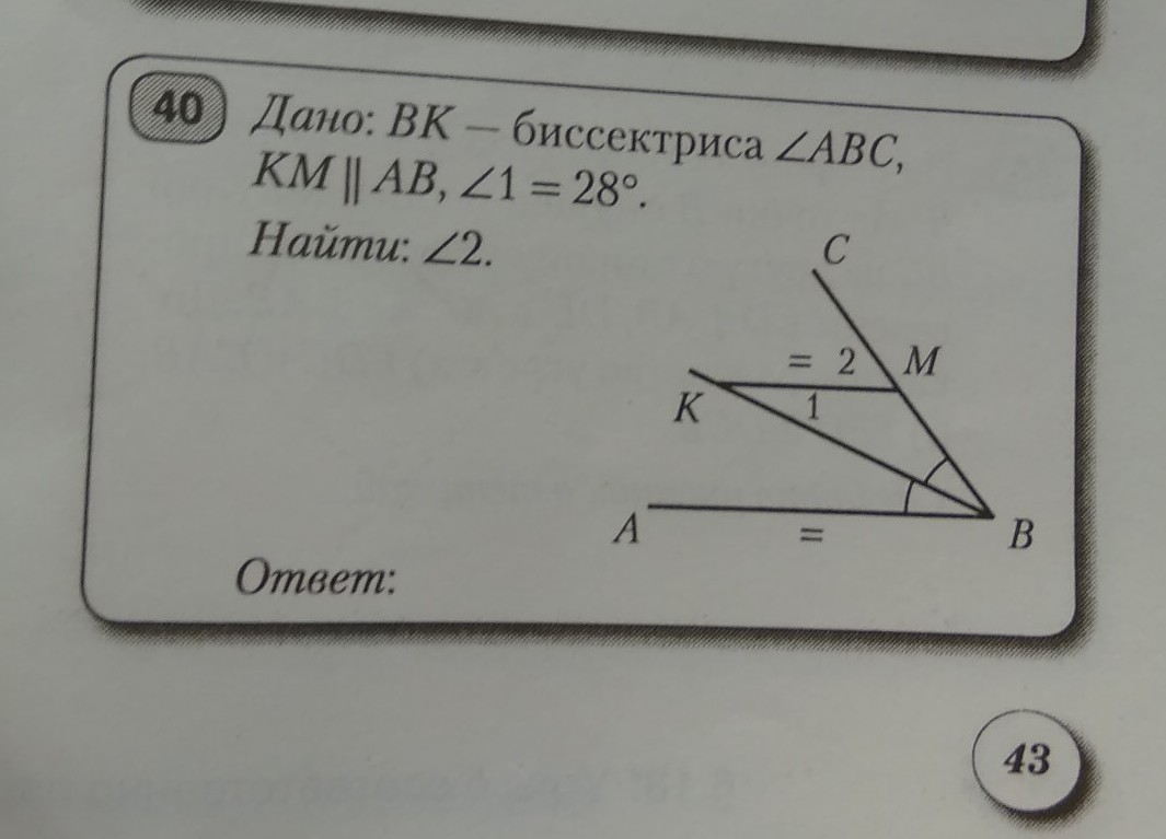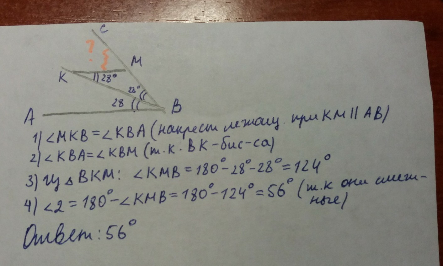 Дано АВ║КМ, КВ и СВ-секущие. Из свойства параллельных прямых, ∠1=∠АВК=28°, ∠2=∠АВС=2·∠АВК=2·∠1, т.к. ВК-биссектриса ∠АВС.