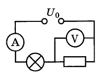 Электрическая цепь, схема которой изображена на рисунке, подключена к аккумулятору. Напряжение на его клеммах равно U_0. Показания идеальных амперметра и вольтметра равны соответственно I и U. Установите соответствие между физической величиной и формулой, по которой ее можно рассчитать.