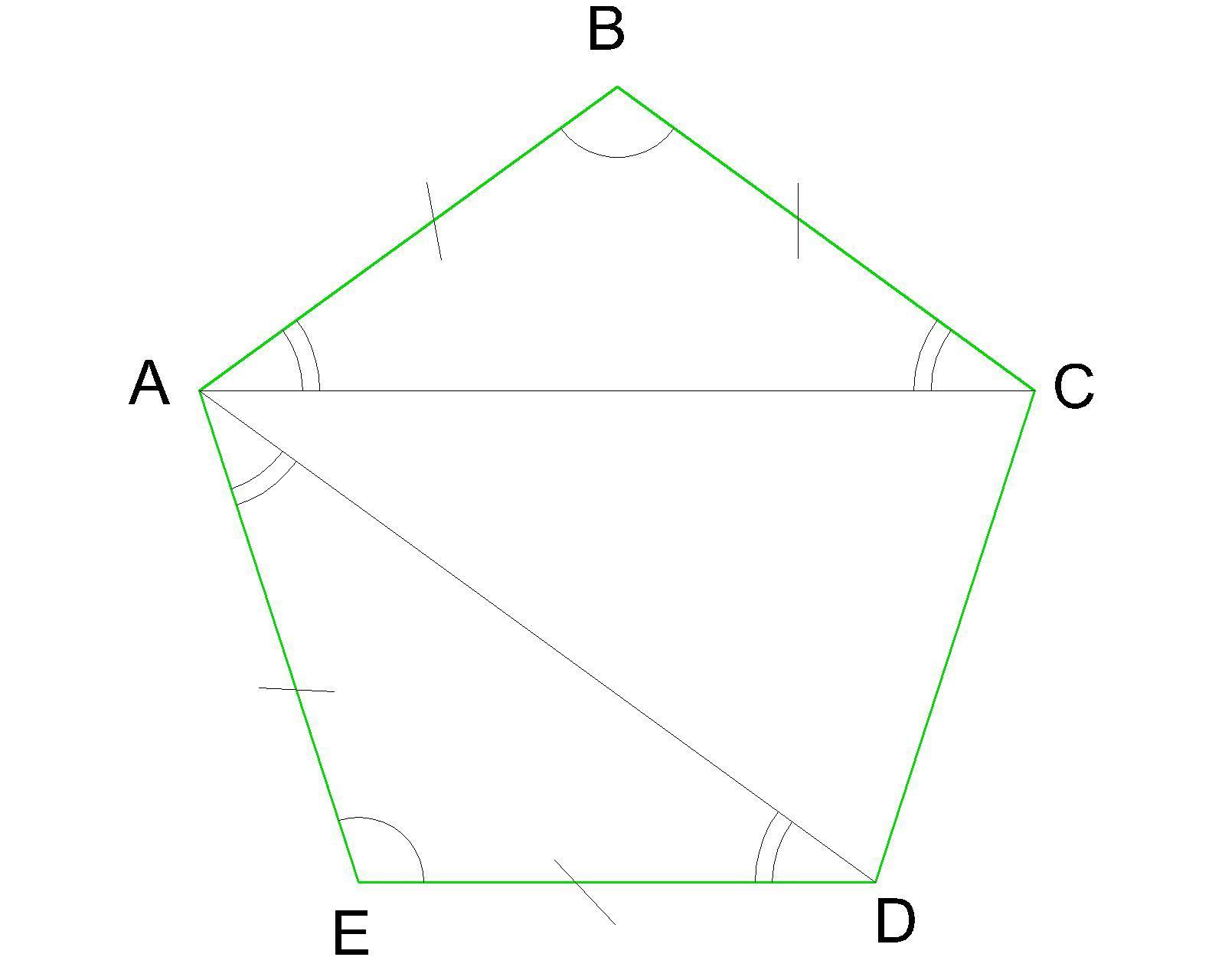 Диагонали АС и АД образуют 2 равных равнобедренных ΔАВС и ΔАЕД, где основаниями являются диагонали пятиугольника.