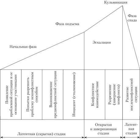 Обычно в социальном конфликте выделяют четыре стадии развития: