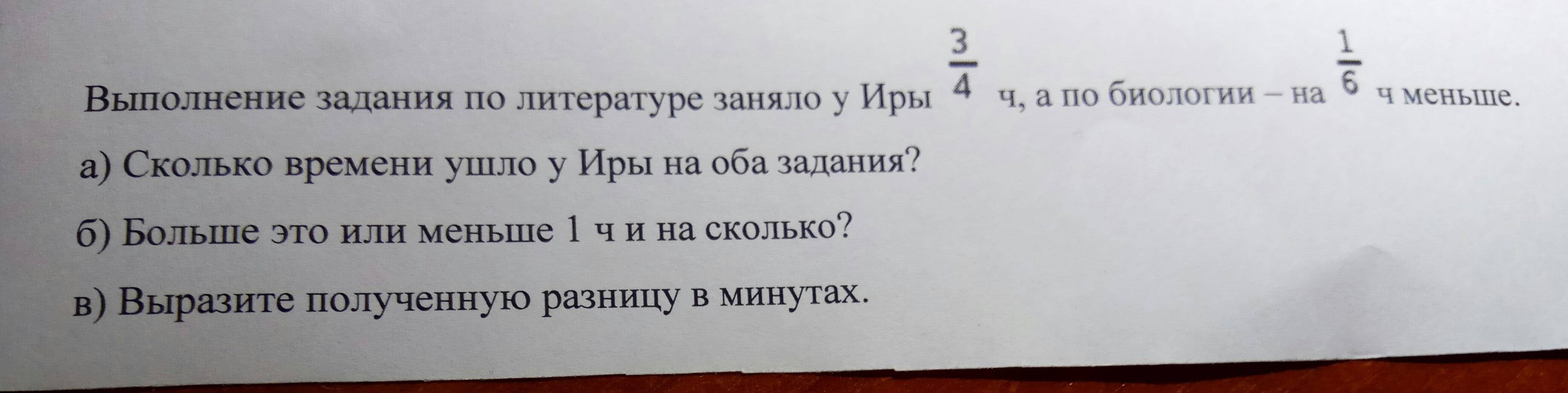 1)3/4ч-1/6ч=(9-2)/12=7/12(ч)-ушло на задание по биологии.