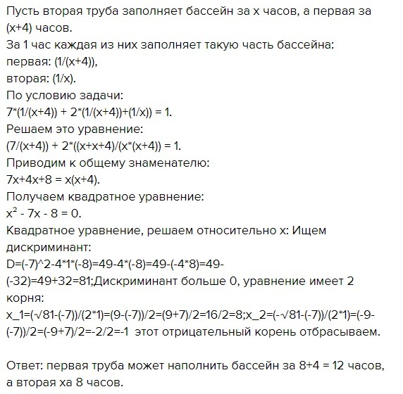 Бассейн наполняется водой с помощью двух труб. Когда первая труба проработала 7 часов включили вторую трубу. Вместе они проработали 2 часа до полного наполнения бассейна. За сколько часов может наполнить бассейн каждая труба, работая отдельно, если первой надо для этого на 4 часа больше, чем второй?