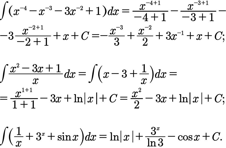 Во всех интегралах использовали табличные интегралы. В интеграла под 2) сначала сделали преобразование - почленное деление.