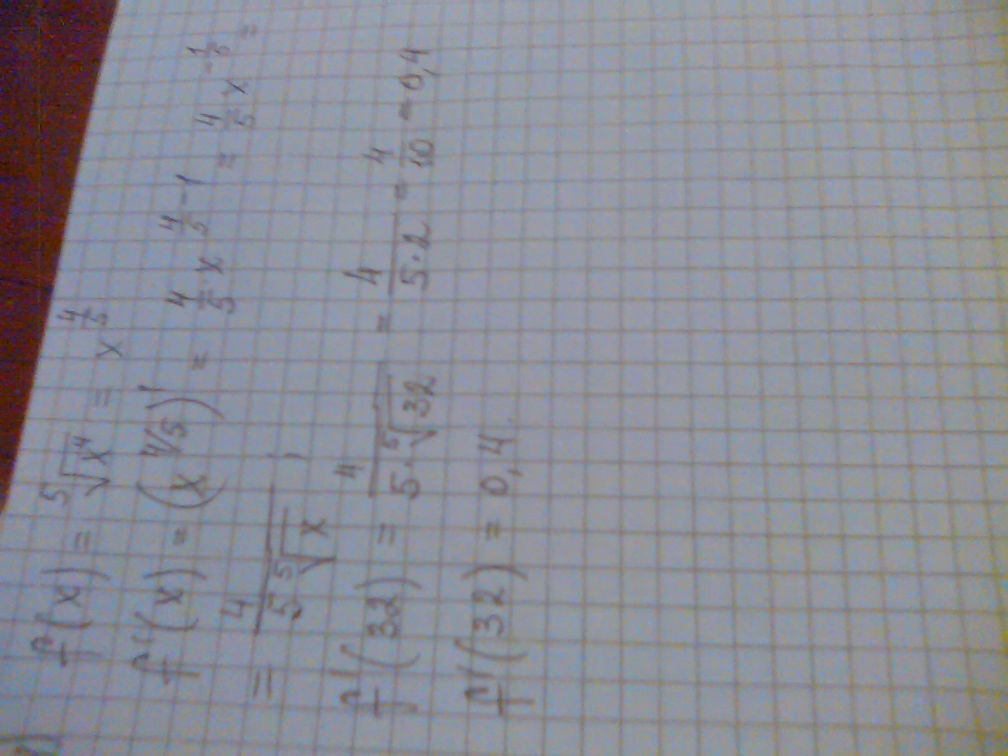 1) Найдём значение производной функции представив её в виде степени: F(x)= x^4/5. Тогда f'(x) = 4/5(x)^-1/5. Тогда f'(32)= 4/5*(32)^-1/5 = 4/103=0,4. Ответ: 0,4