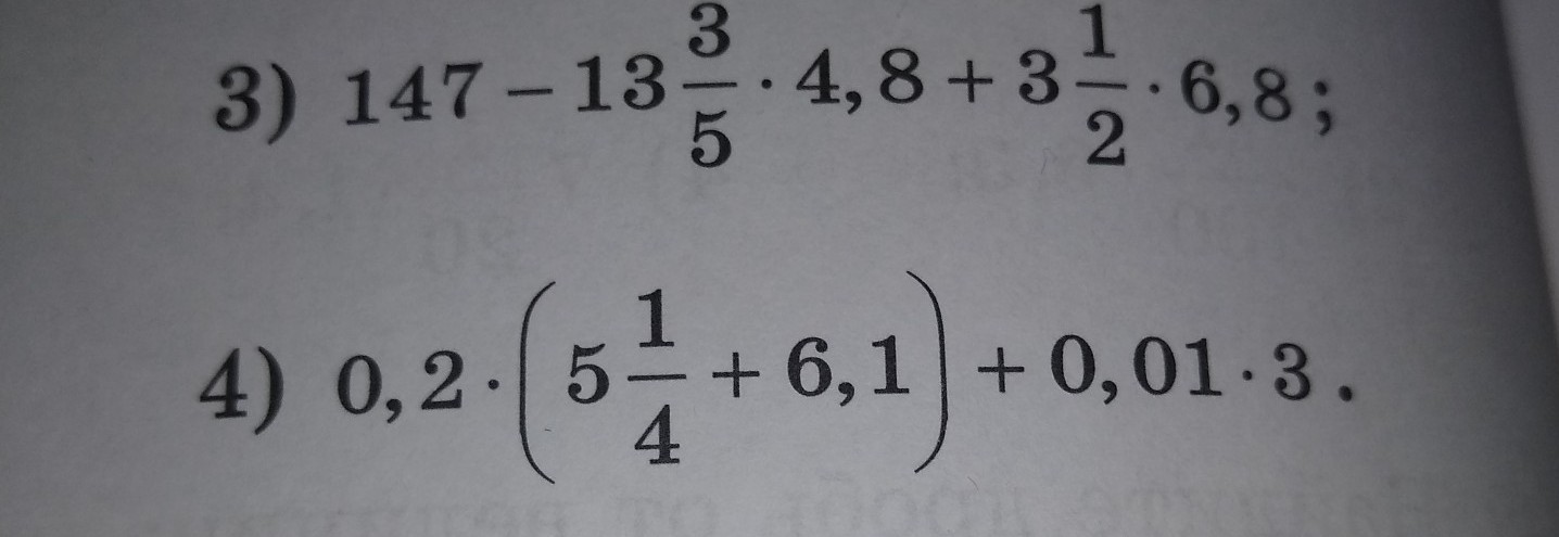 Выполни действия в десятичных дробях: 3) 147- 13 3/5 * 4,8+ 3 1/2*6,8=