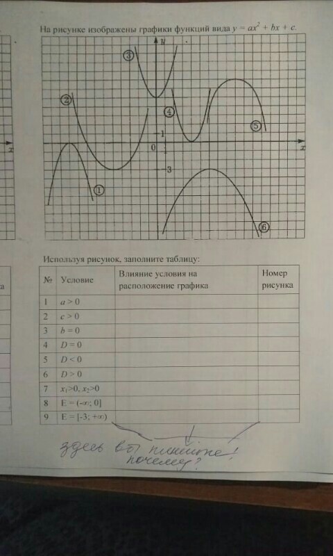 6) D>0 : парабола имеет две точки пересечения с ОХ, №№2,5.