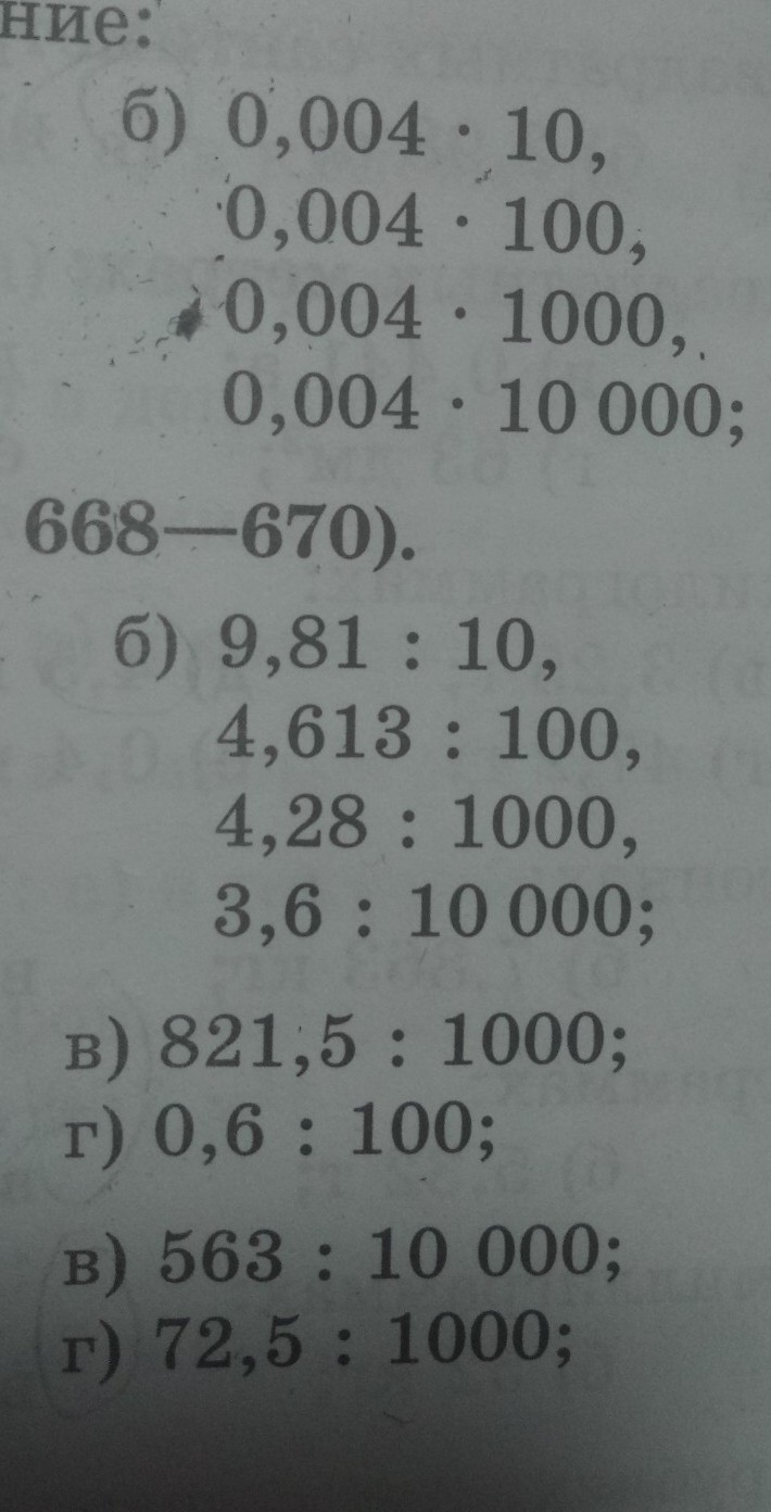Объясняю, если ты умнажаешь на 10, 1000, 10000 и т.д. то сдвигаешь запятые вправо на столько чисел, сколько нулей во втором множетеле. А если делишь, то запятую сдвигаешь влево.