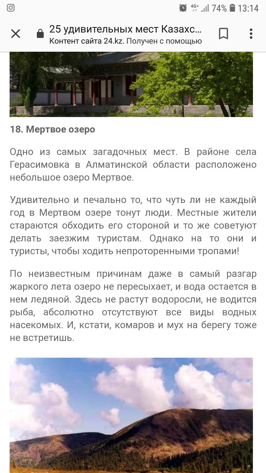Dead Lake One of the most mysterious places. In the area of the village of Gerasimovka in Almaty region there is a small lake Dead. It is surprising and sad that almost every year people drown in the Dead Lake. Locals try to avoid him and advise tourists to do the same. However, they and the tourists, to walk the unbeaten paths! For unknown reasons, even in the midst of a hot summer, the lake does not dry up, and the water remains icy in it. Algae do not grow here, fish are not found, all types of aquatic insects are completely absent. And by the way, mosquitoes and flies on the shore, too, can not be found.