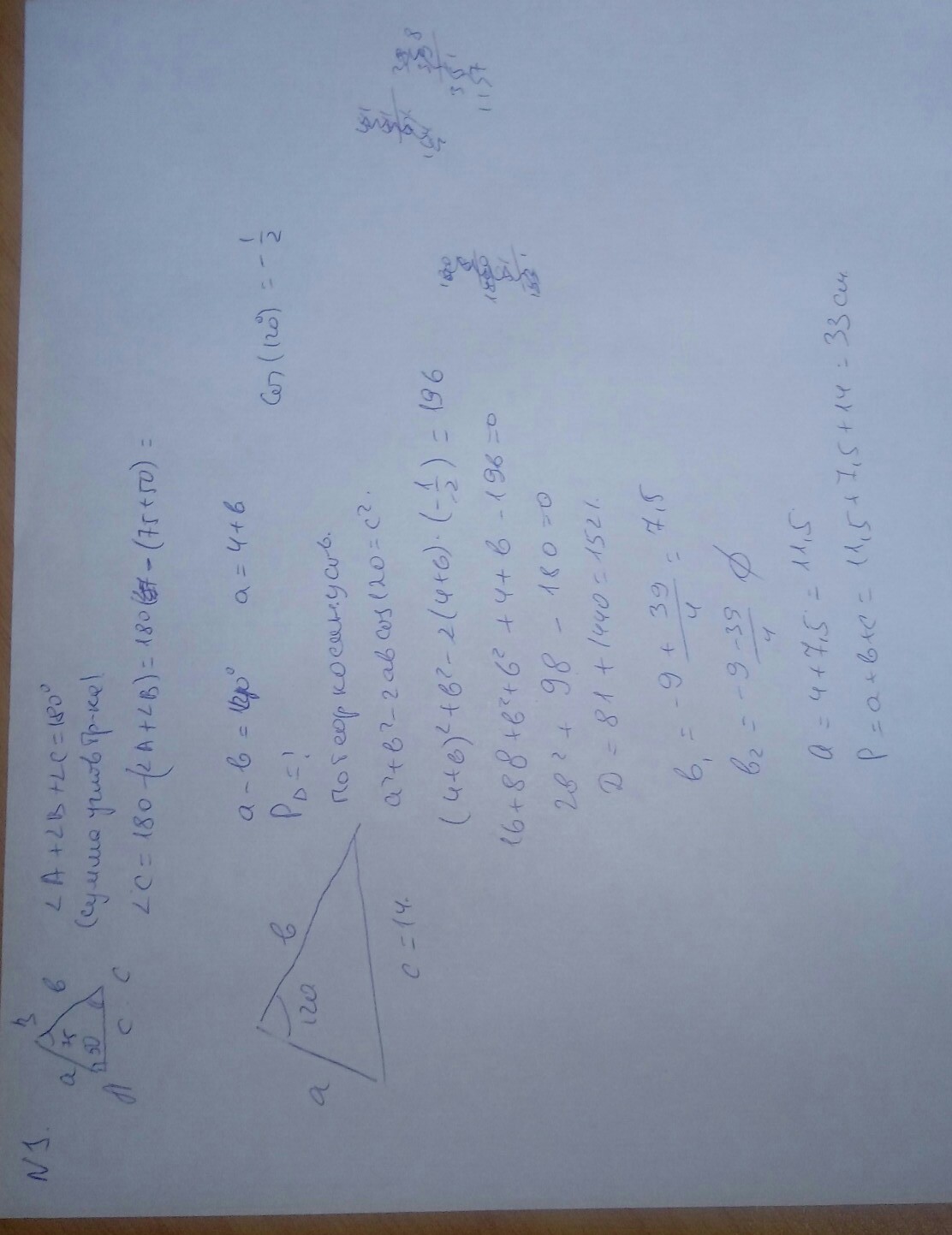 різниця двох сторін трикутника дорівнює 4 см а кут між ними 120 градусів. Знайдіть периметр якщо третя сторона 14 см