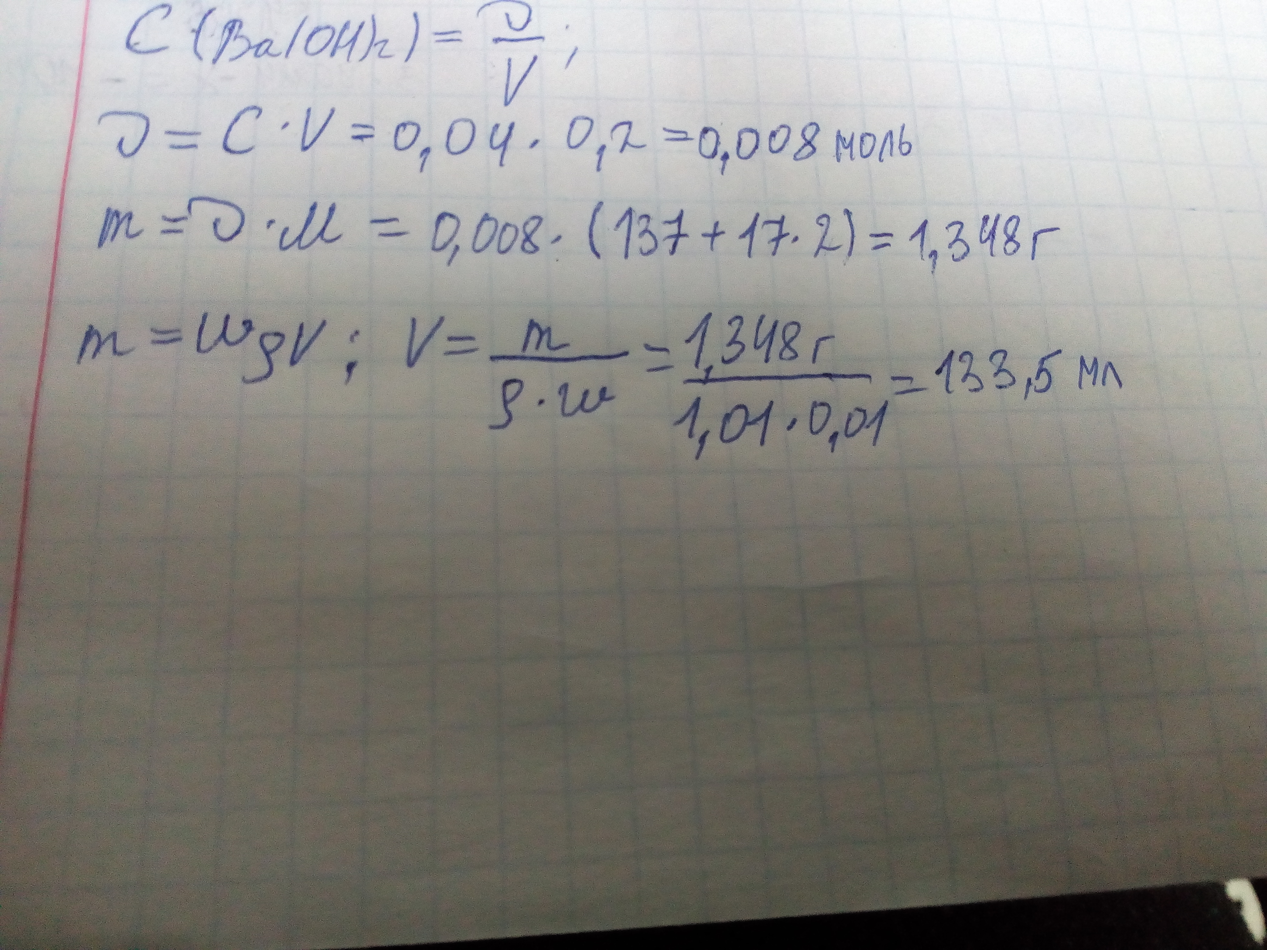 V(p-pa Ba(OH)₂) = m/ρ = 136,8 г./1,01 г/мл = 135,45 мл.