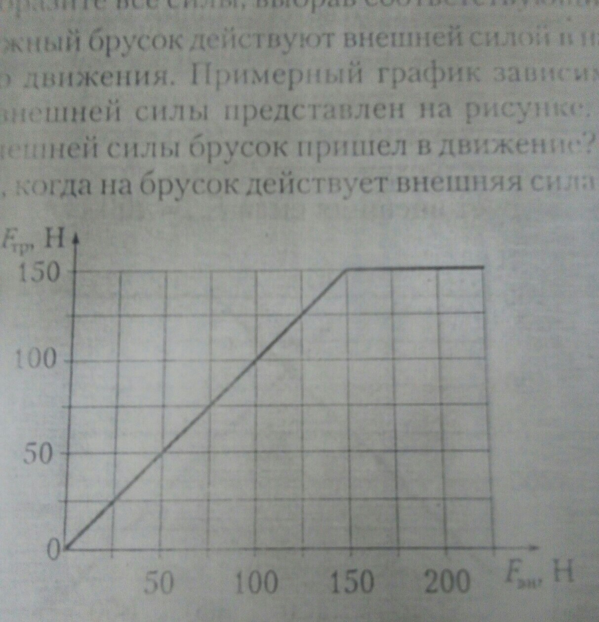 На неподвижный брусок действуют внешней силой в направлении возможного движения. Примерный график зависимости силы трения от внешней силы представлен на рисунке. При каком значении внешней силы брусок пришел в движение? Чему равна сила трения, когда на брусок действует внешняя сила Fmi = 100 Н?