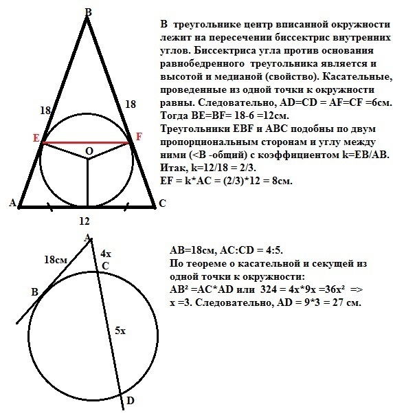 1. В треугольнике центр вписанной окружности лежит на пересечении биссектрис внутренних углов. Биссектриса угла против основания равнобедренного треугольника является и высотой и медианой (свойство). Касательные, проведенные из одной точки к окружности равны. Следовательно, AD=СD = AF=CF =6см.