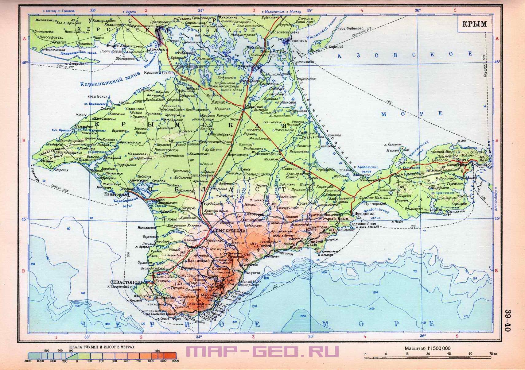 Крым лежит между 44 и 46 параллелью и 32 и 37 меридианом.