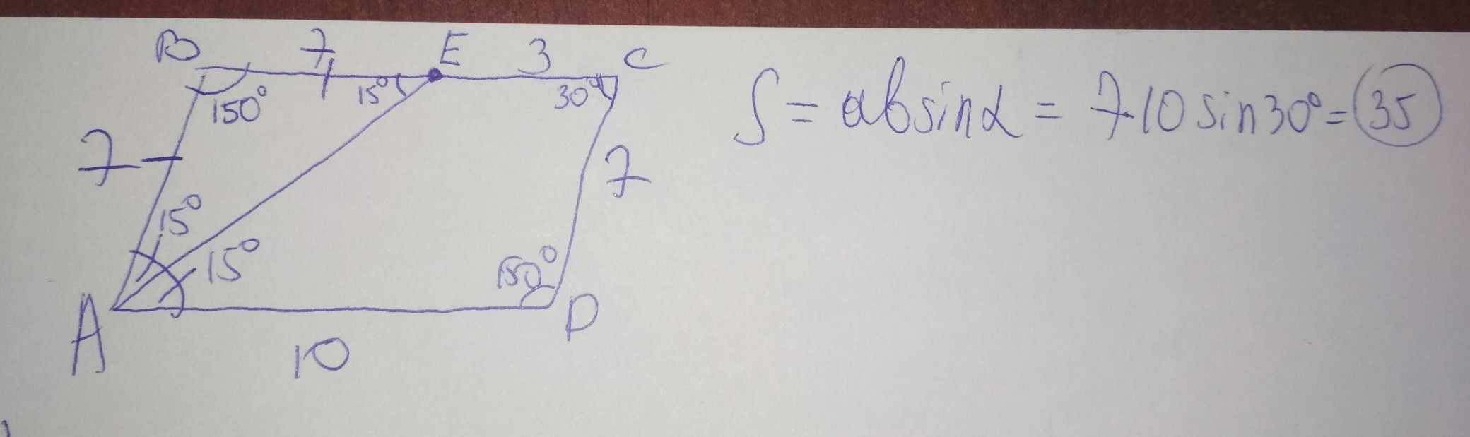 биссектриса угла а параллелограмма абсд пересекает его сторону бс в точке е найдите площадь параллелограмма абсд если бе равно 7 ес равно 3 а угол абс равен 150