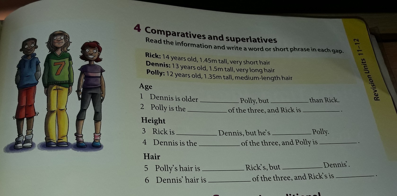 5. Polly's hair is longer than Rick's, but shorter than Dennis'.