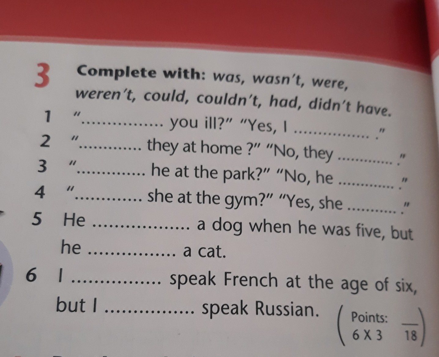 complete with: was , wasn't , were , weren't , could , couldn't , had , didn't have .