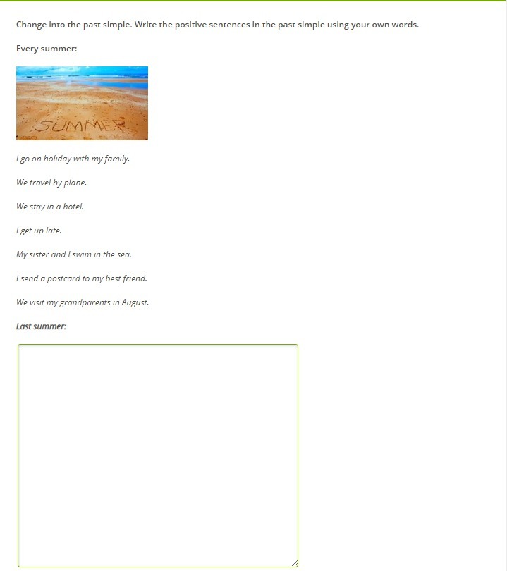 we traveled by plane. we stayed in a hotel. i got up late.my sister and i swam in the sea. I sent a postcard to my best friend. we visited my grandparents in August.