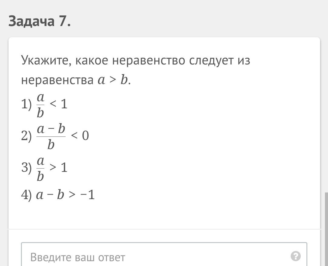 В четветром а>-1+b. А правильный ответ: 3) где а/b>1, значит, a>b.