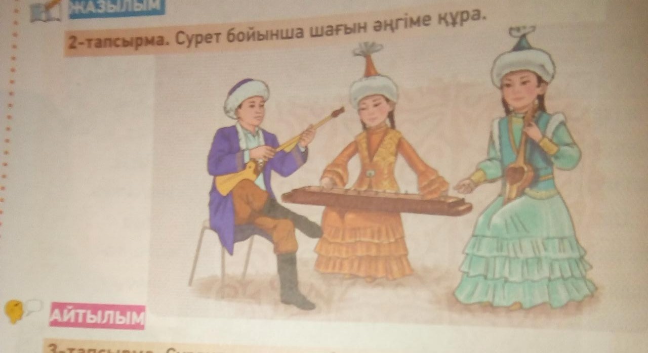 Марат, Айжан, Маржан аншилер. Марат Домбыра ойнайды, Айжан алты баканды ойнайды, Маржан кобызда ойнайды олар бир топ болып ойнайды. Сойтип олар уакыт откизеди. Олар оте кушти ойнайды.
