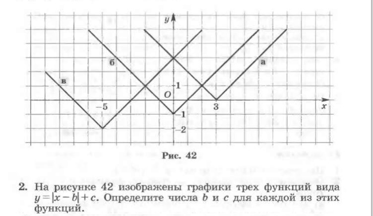 На рисунке 42 изображены графики функций вида у=|x-в|+с. Определите числа b и с для каждой из этих функций.