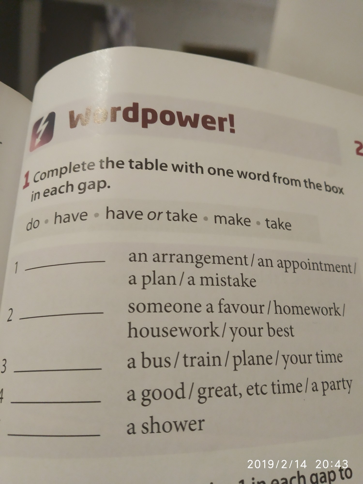1-make. 2-do. 3-take. 4-have or take. 5- take