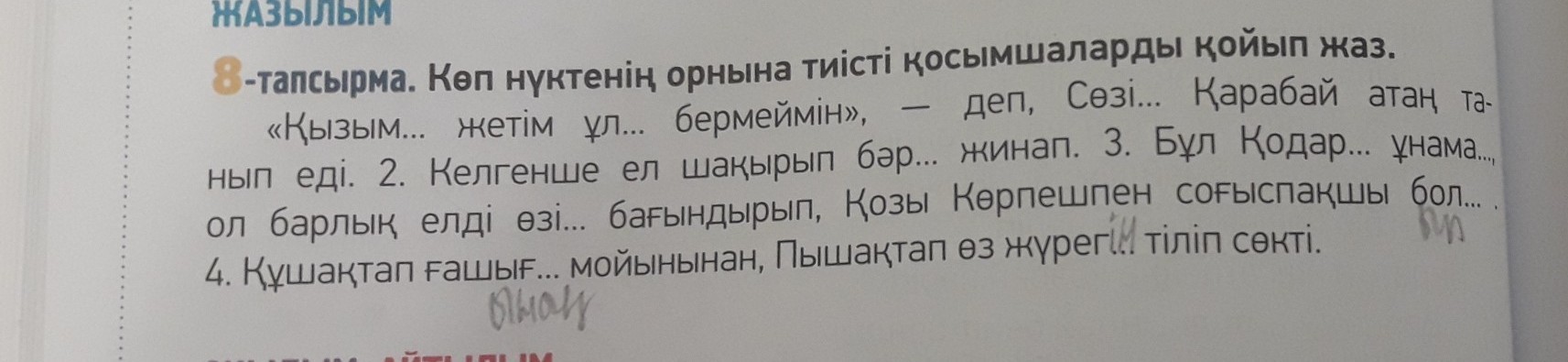 4. Құшақтап ғашығының мойынынан, пышақтап өз жүрегін тіліп сөкті.