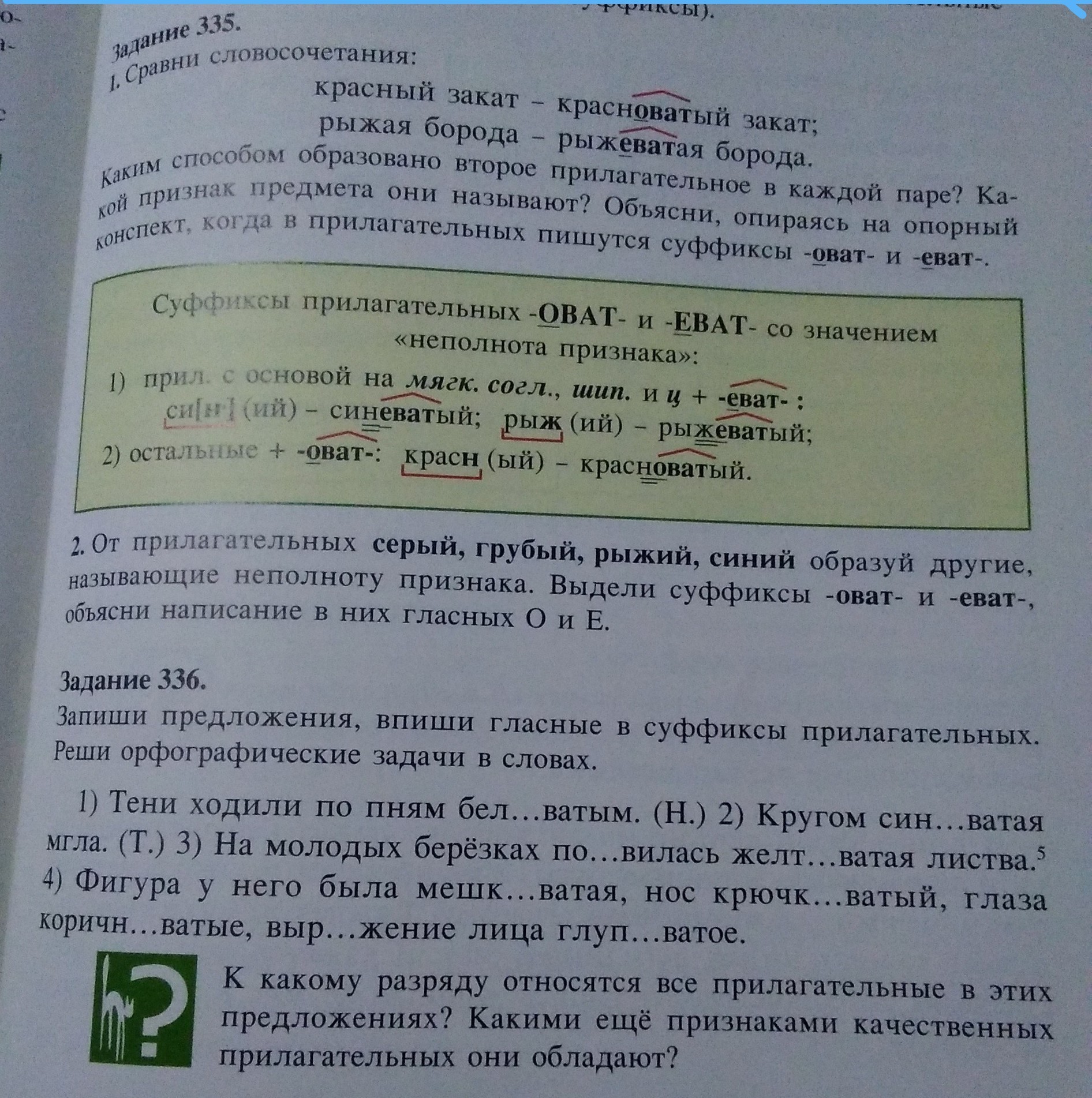 1. Тени ходили по пням беловатым. 2. Кругом синеватая мгла. 3. На молодых березках появилась желтоватая листва. (что значит цифра 5?) 4. Фигура у него была мешковатая, нос крючковатый, глаза коричневатые, выражение лица глуповатое.