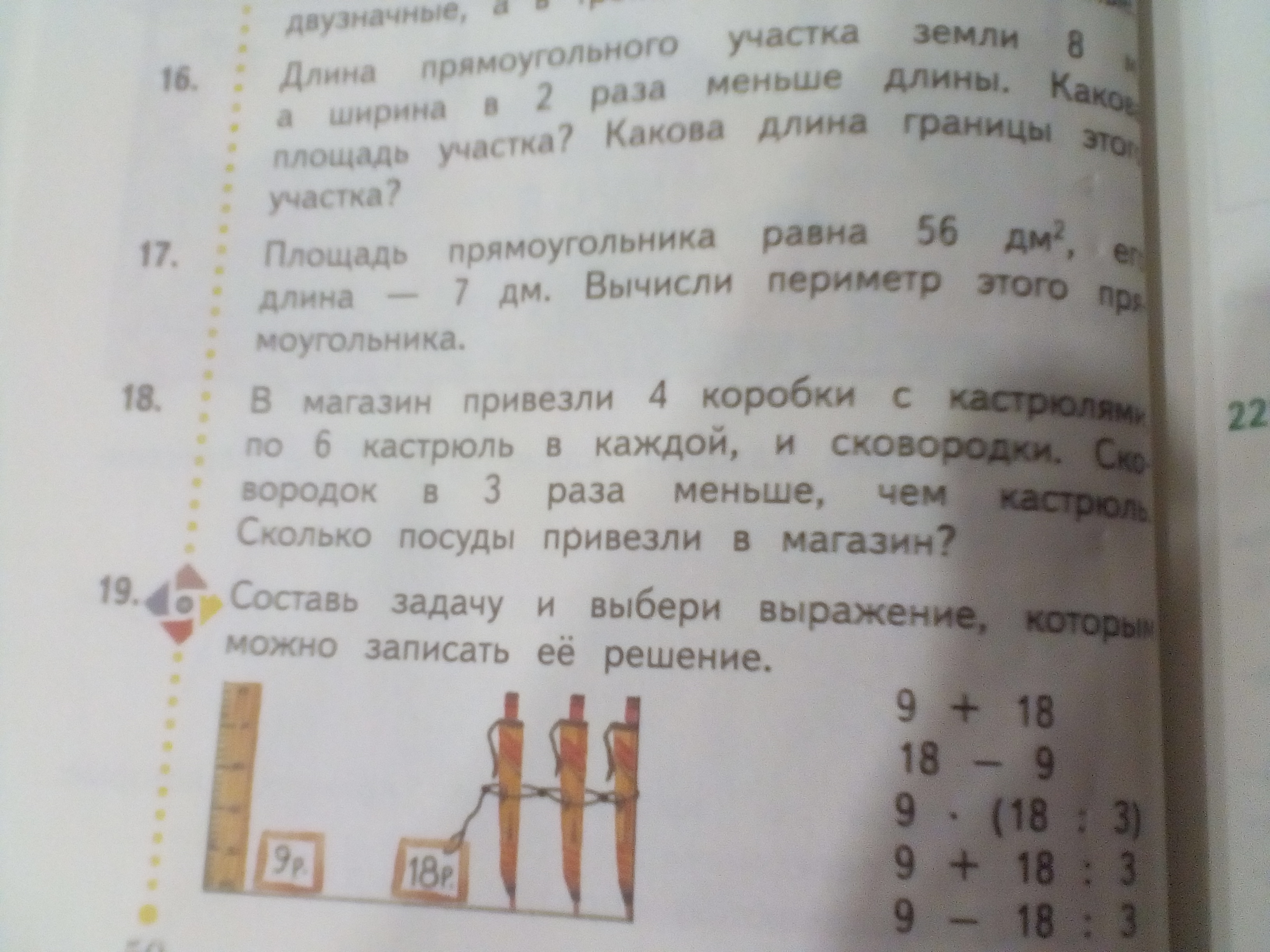 4 коробки,по 6 кастрюль в каждой.Это будет:4*6=24. (кастрюль) Сковородок в 3 раза меньше: 24:3=8 (сковородок). 24+8=32(всего посуды).