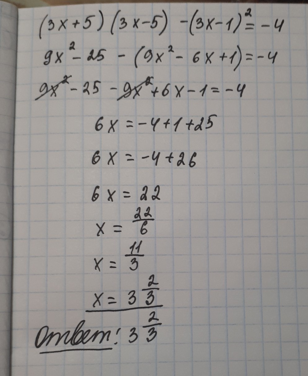 9х^2 - 25 - 9х^2 + 6х - 1 = -4