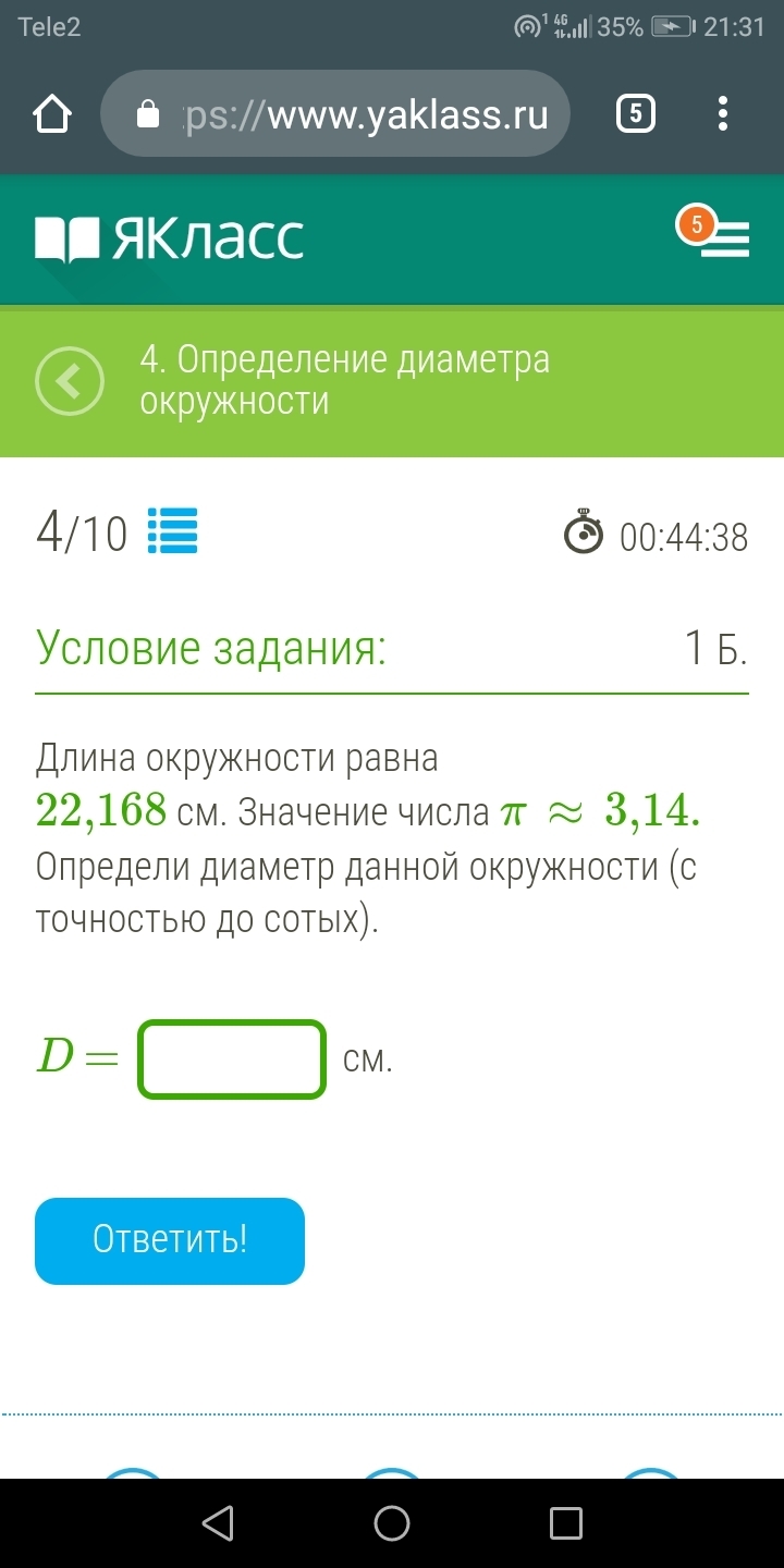 Длина окружности равна 22,168 см. Значение числа π≈3,14.