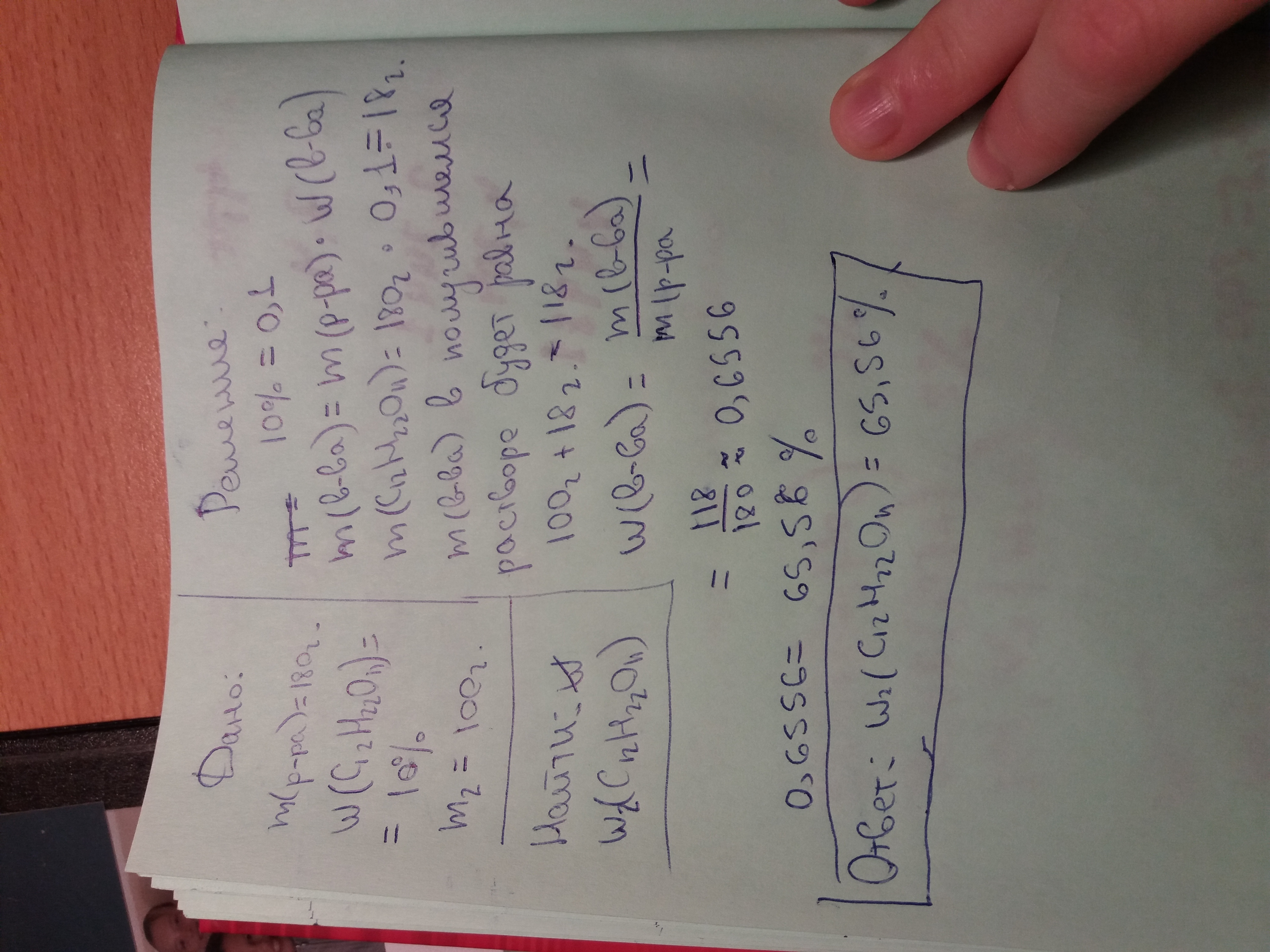 К 180 г раствора с массовой долей сахара 10% добавили 100 г сахара. Сахар полностью растворился. Вычислите массовую долю сахара во вновь полученном растворе.