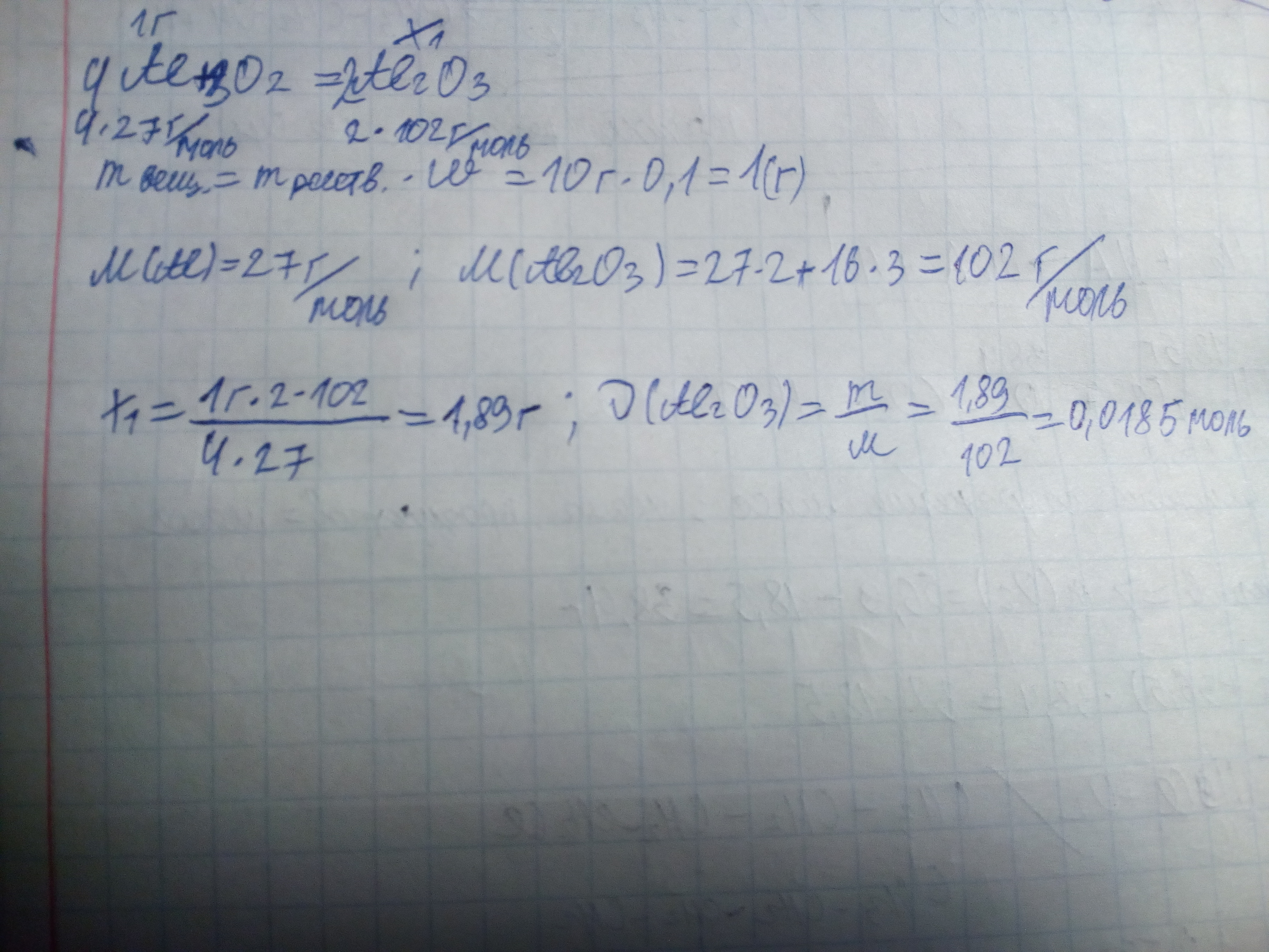 Как можно получить массу и количество вещества оксида алюминия, если сжечь 10 г алюминия, содержащего 10 процентов примеси ( составить формулу )