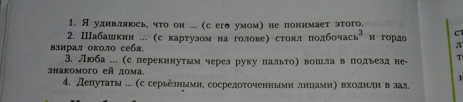 1. Я удивляюсь, что он, с его умом, не понимает этого. 2. Шабашкин, с картузом на голове, стоял подбочась и гордо взирал около себя. 3. Люба, с перекинутым через руку пальто, вошла в подъезд незнакомого ей дома. 4. Депутаты, с серьезными, сосредоточенными лицами, входили в зал.