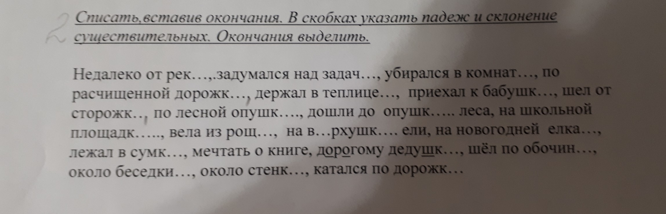 Недалеко от реки (Р.п., 1 скл.), задумался над задачей (Т.п., 1 скл.), убирался в комнате(П.п., 1 скл.), по расчищенной дорожке (Т.п., 1 скл.), держал в теплице (П.п., 1 скл.), приехал к бабушке (Д.п., 1 скл.), шёл от сторожки (Р.п., 1 скл.), по лесной опушке (Д.п., 1 скл.), дошли до опушки (Р.п., 1 скл.) леса, на школьной площадке (П.п., 1 скл.), вела из рощи (Р.п., 1 скл.), на верхушки ели (П.п., 3 скл.), на новогодней ёлке (П.п., 1 скл.), лежал в сумке (П.п., 1 скл.), мечтать о книге(П.п., 1 скл.), дорогому дедушке (Р.п., 1 скл.), шёл по обочине (Р.п., 1 скл.), около беседки (Р.п., 1 скл.), около стенки(Р.п., 1 скл.), катался по дорожке(Р.п., 1 скл.).