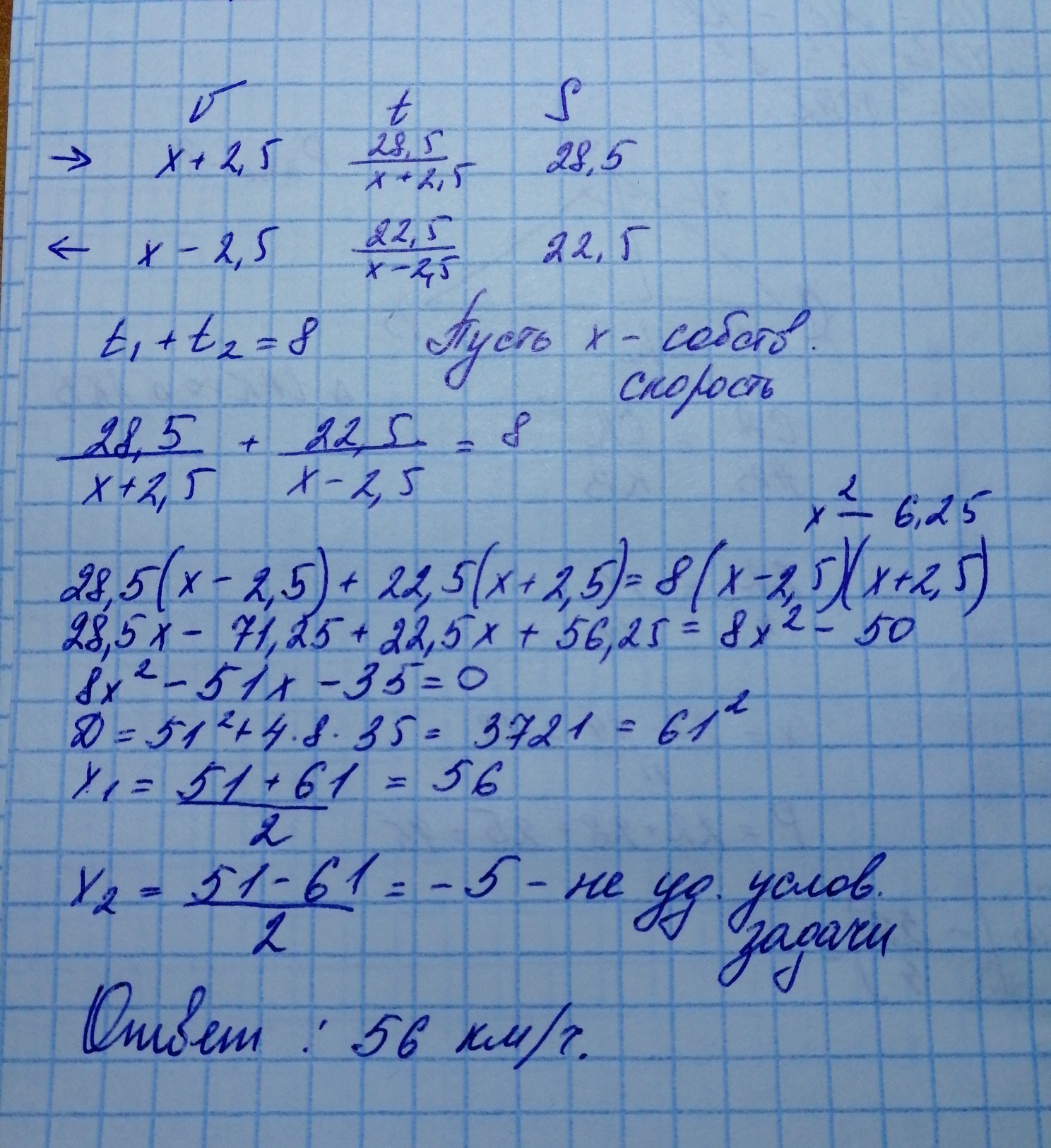 Лодка прошла против течения 22,5 км и по течению 28,5 км, затратив на весь путь 8 ч. Скорость течения реки 2,5 км/ч . Найдите собственную скорость людки.