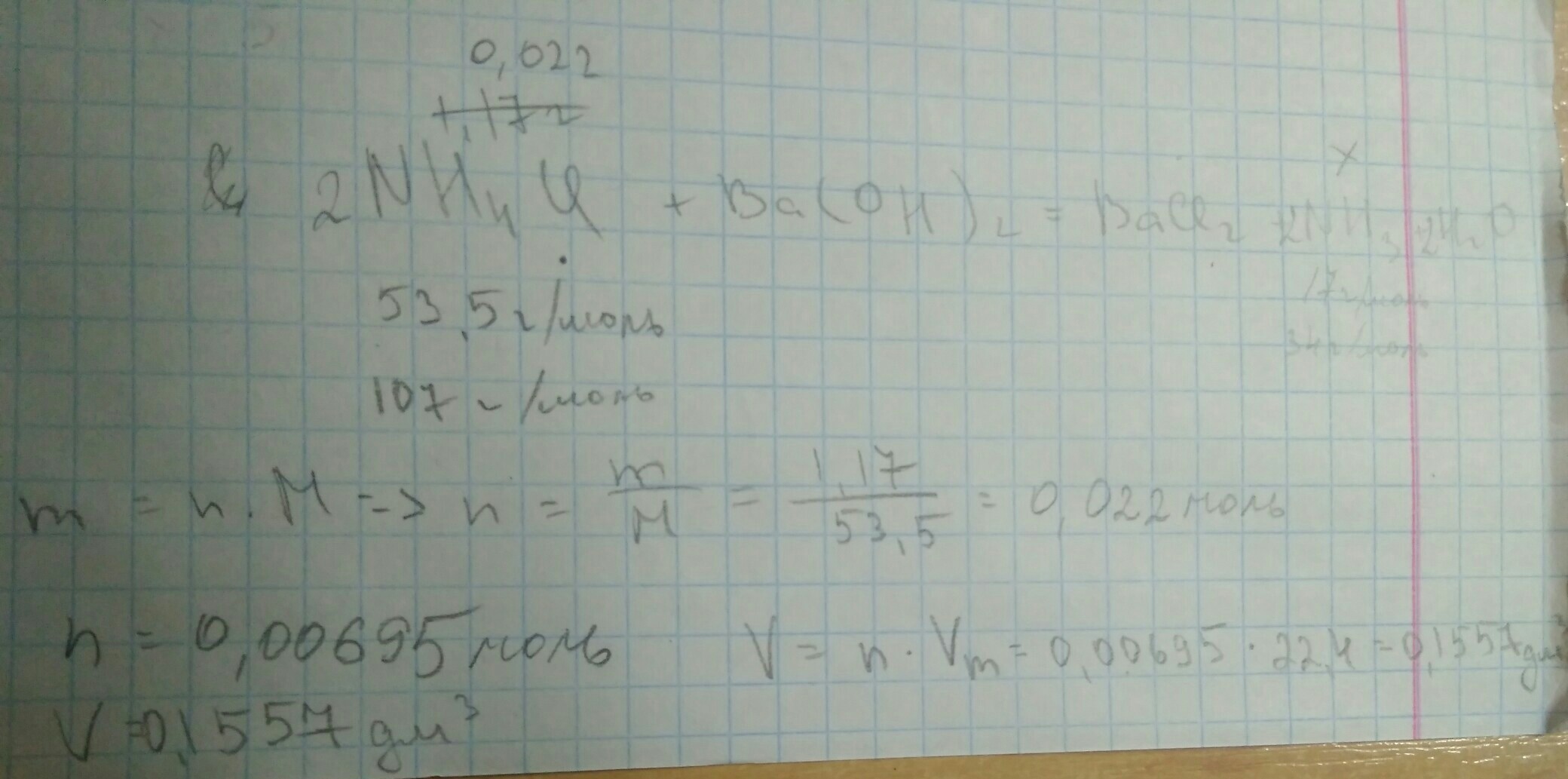 Вычеслите объем аммиака(н. у.), который выделится при взаимодействии хлорида аммония массой 1,17г с гидроксидом бария.