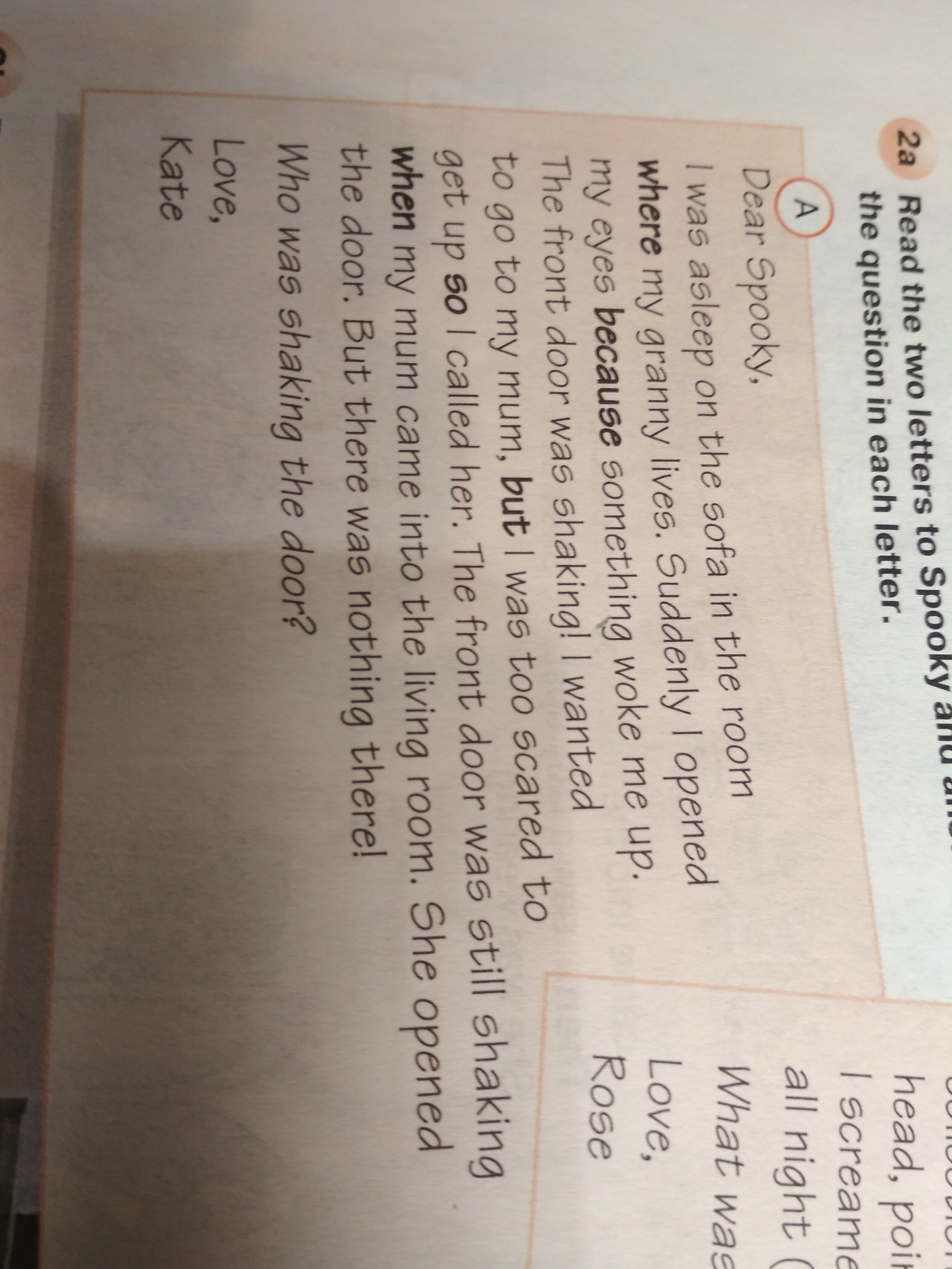 я заснула на диване в комнате, где живет моя бабуля. внезапно я открыла глаза, потому что что-то разбудило меня.передняя дверь тряслась! я хотела пойти к маме, но слишком боялась вставать, поэтому позвала ее. передняя дверь все еще тряслась, когда моя мама зашла в гостиную. она открыла дверь. но там ничего не было!