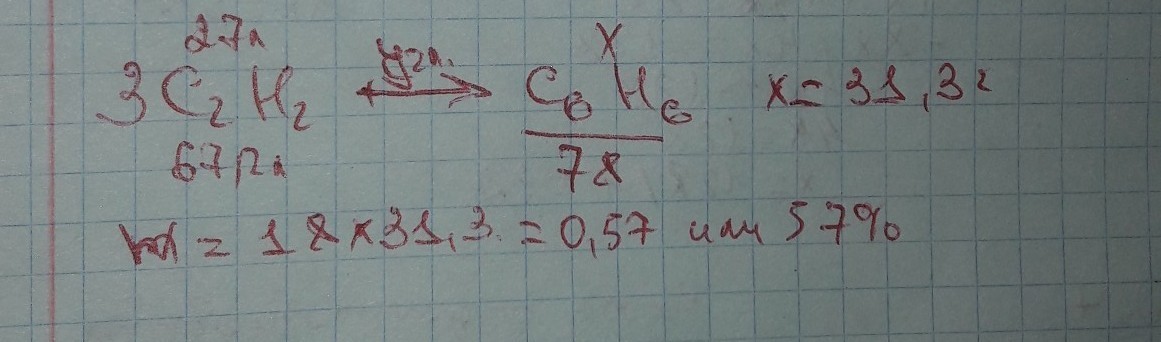 Із ацетилену об'ємом 27 л та під дією активованого вугілля, одержано 18 г бензену. Визначте масову частку виходу бензену.