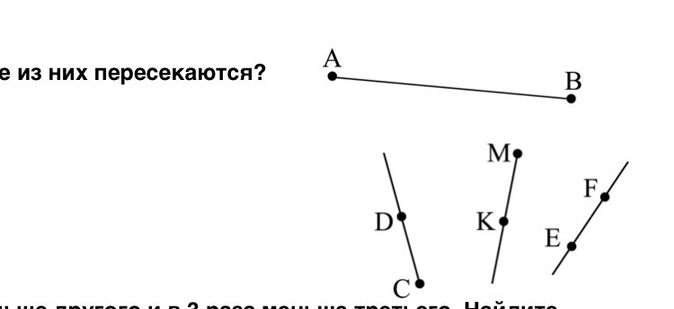 На рисунке изображены 4 линии. Какие из них пересекаются? А. AB и CD Б. MK и EF В. MK и CD; AB и EF Г. CD и AB; MK и EF