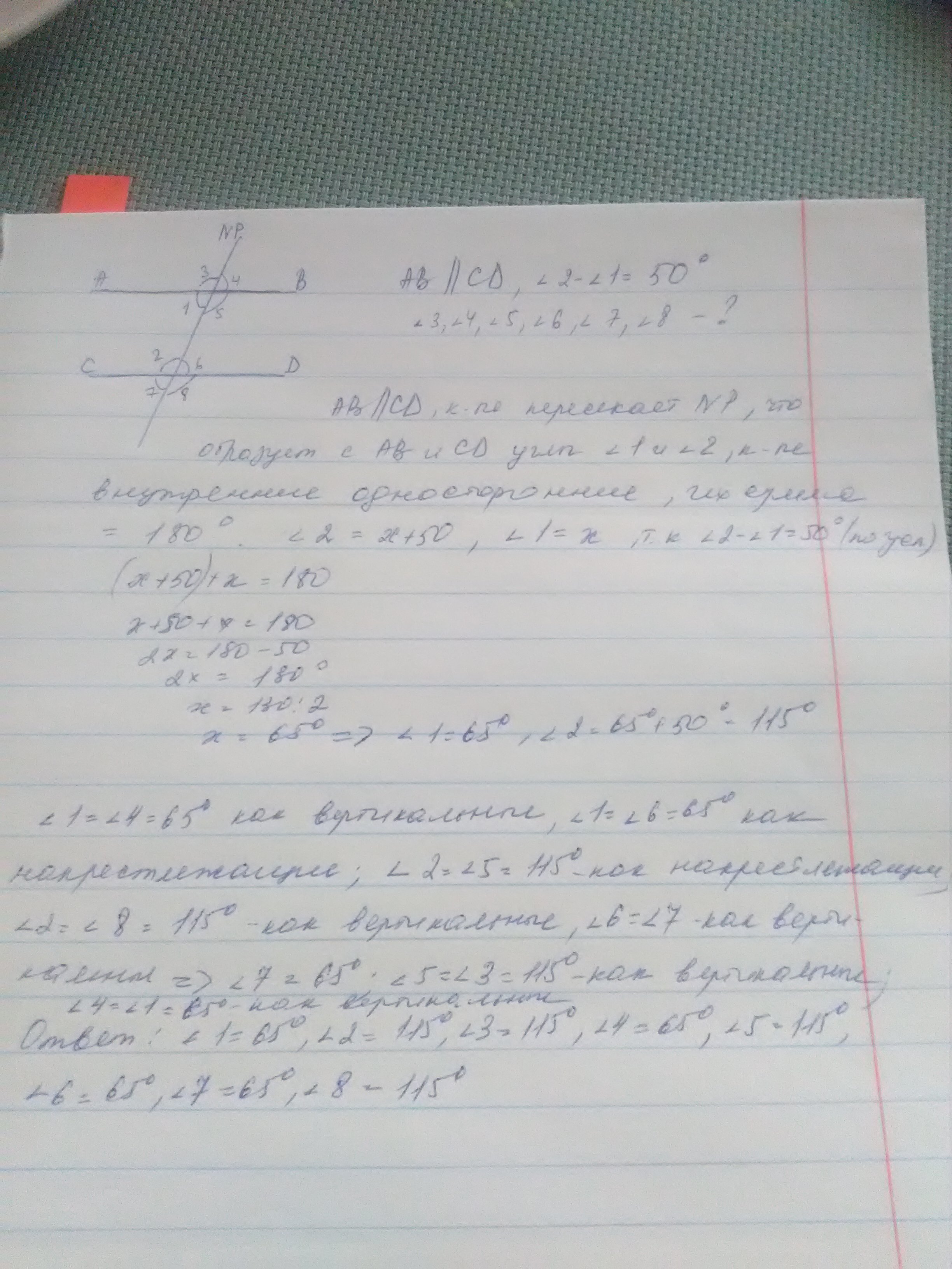 3) прямые AB и CD параллельны, NP -секущая . Разность двух внутренних односторонних углов равна 50°. Найдите все углы, образованные параллельнымт прямыми и секущей.