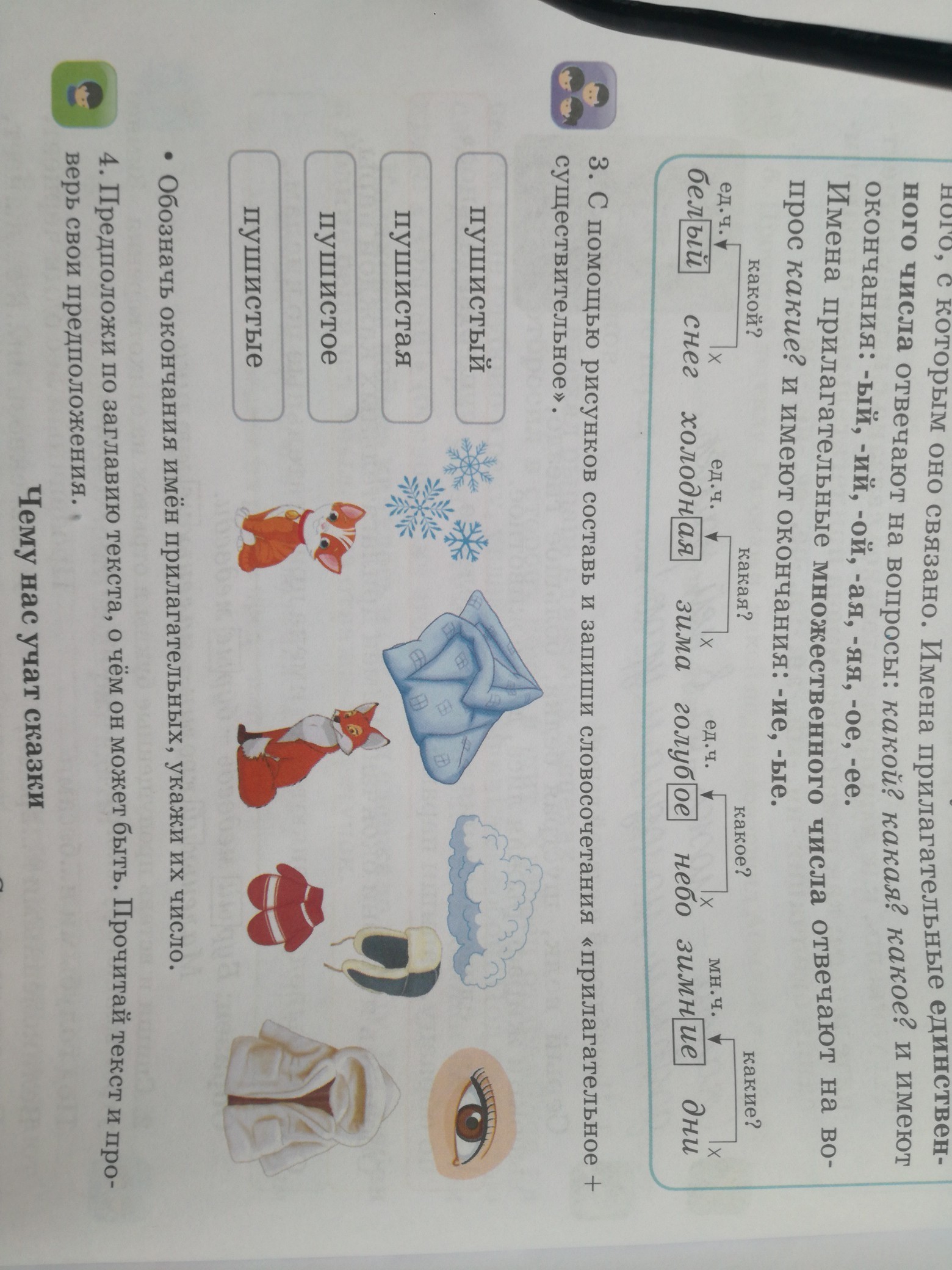 С помощью рисунков составь и запиши словосочетания "прилогательное+существительное". Обозначь окончания имён прилогательных,укажи их число. номер 3.